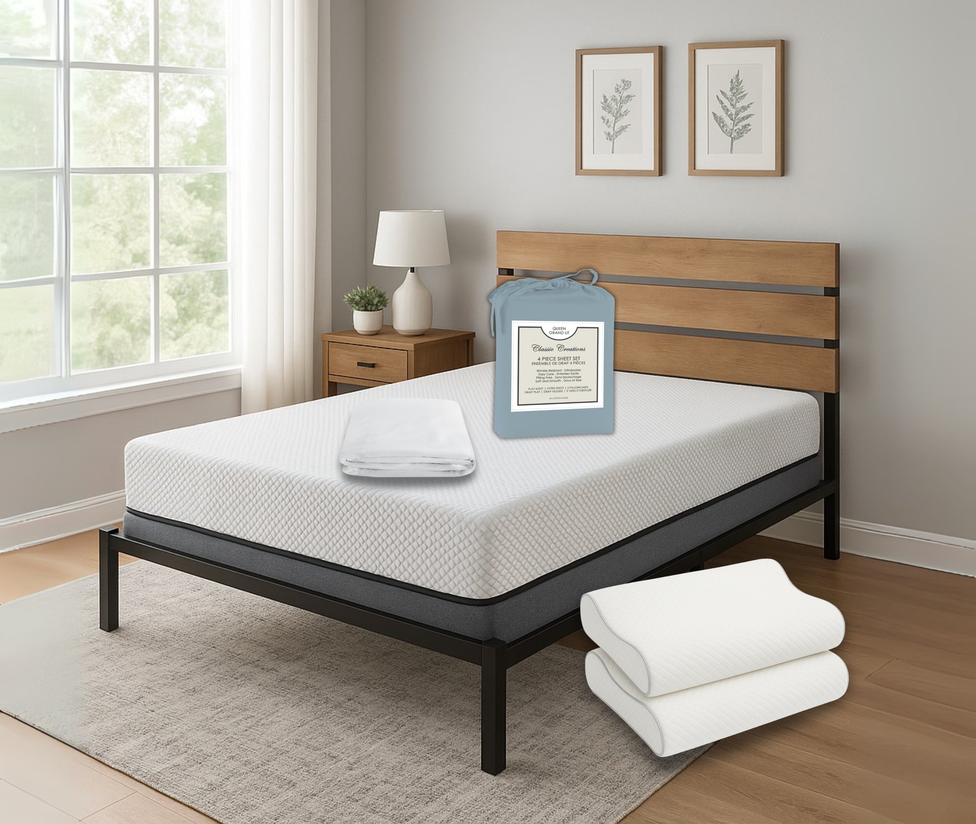 Take the guesswork out of sleep with the Complete Sleep Starter Bundle, a curated bedroom solution designed to deliver better sleep from the ground up. Whether you're upgrading your current setup or moving into a new space, this bundle brings together 5 premium essentials, including a supportive mattress, stylish platform bed, and breathable sleep accessories, all selected for performance, comfort, and value.