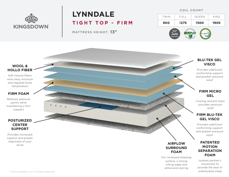 The Kingsdown Lynndale Tight Top Firm Mattress is designed for sleepers who prefer a firm, supportive feel with enhanced pressure relief and cooling performance. Built with multiple layers of Blu-Tek® gel visco foams, firm comfort foams, and a posturized center support system, this mattress helps maintain proper spinal alignment throughout the night.