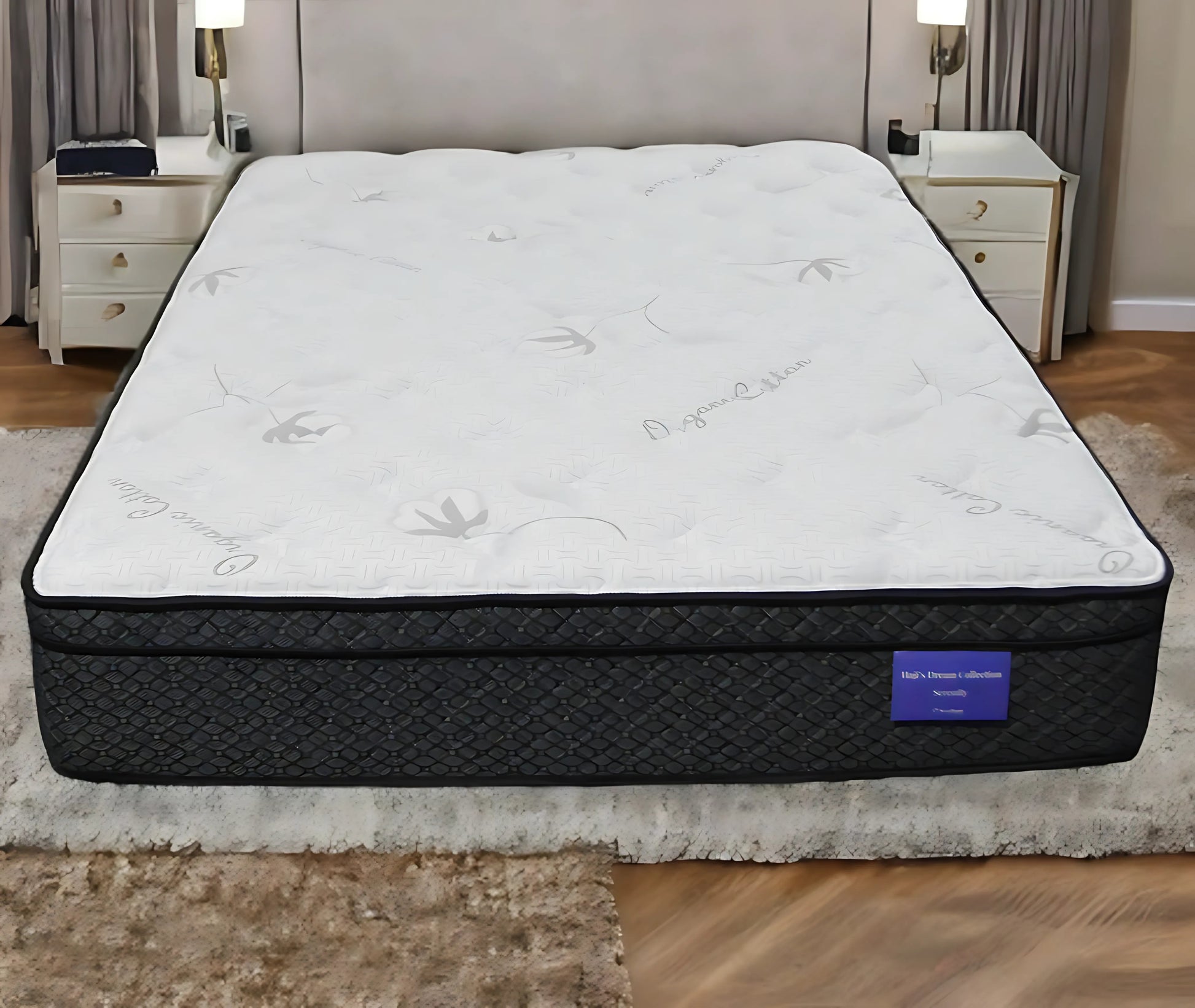 The Serenity Mattress, part of Haji’s Dream Collection, delivers the perfect harmony of gentle materials and resilient support. Crafted with organic cotton, gel-infused memory foam, and advanced coil technology, it’s designed to bring you restorative sleep night after night.